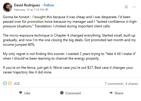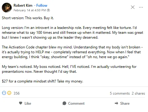 This system is different because it’s not about suppressing anxiety or just “thinking positive.” It’s about using your body’s natural activation response as fuel for success. Everything is based on the latest research from Harvard, Stanford, and top performance coaches. You don’t need a big budget, special equipment, or months of training—just follow the daily steps and you’ll see results. Plus, our customers love that the tools are practical, fast, and designed for real-world professionals.